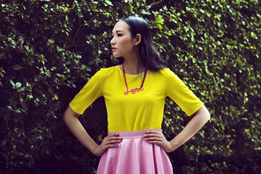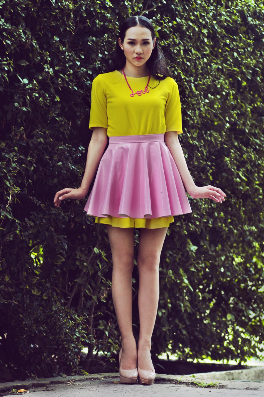| Sự kết hợp giữa chiếc váy vàng trơn và chân váy màu hồng pastel giúp cho bạn có 1 bộ trang phục khác lạ và độc đáo. Chân váy da là điểm nhấn giúp bộ trang phục trở nên đặc biệt hơn. Bộ cánh làm gợi nhớ đến hình ảnh những cô giúp việc trong phim Mỹ, nhưng chắc chắn sẽ khiến mọi người phải chú ý đến phong cách sáng tạo và cuốn hút của bạn. |