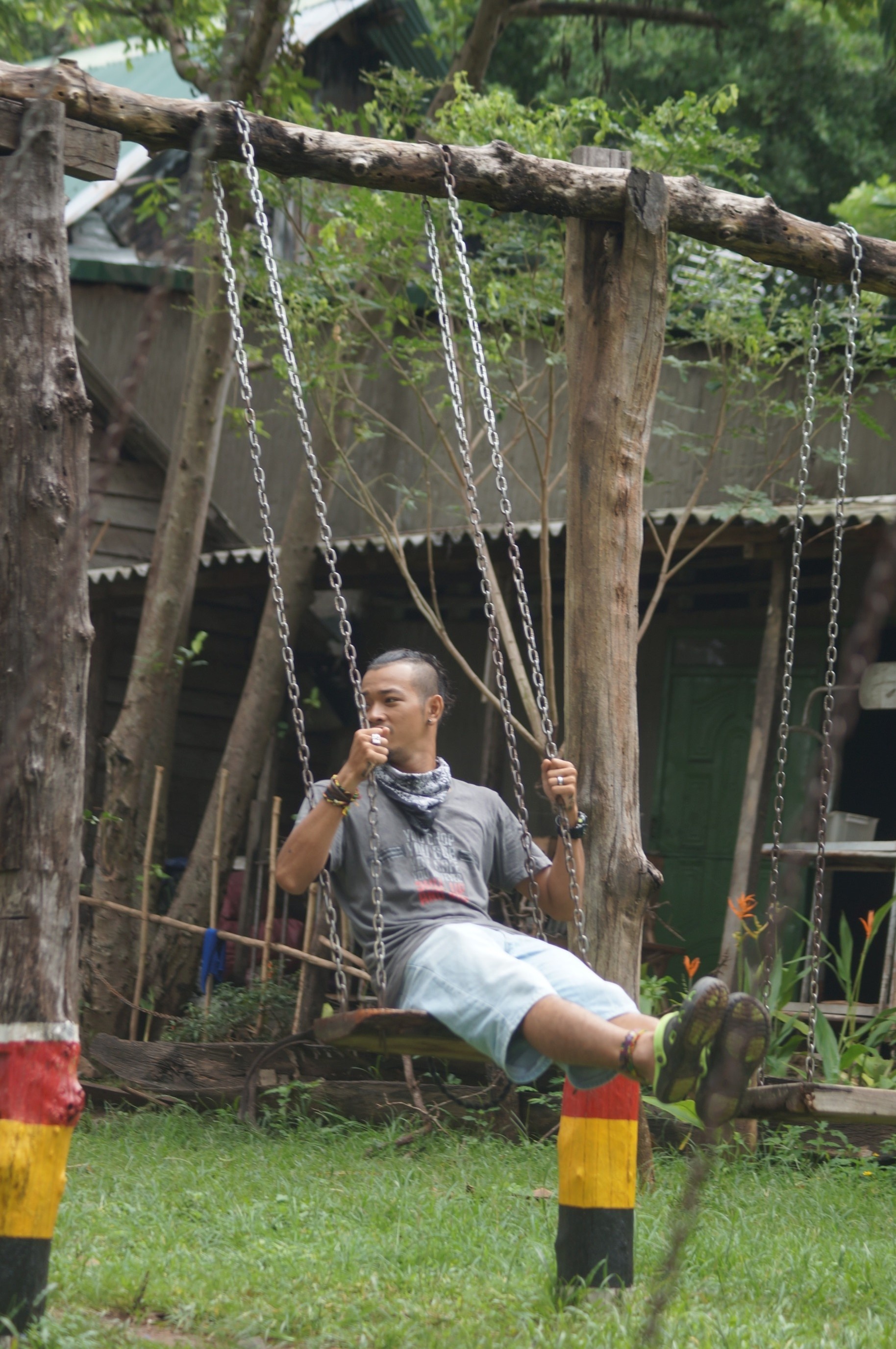| Hoàng Phi nhí nhảnh bên xích đu. |