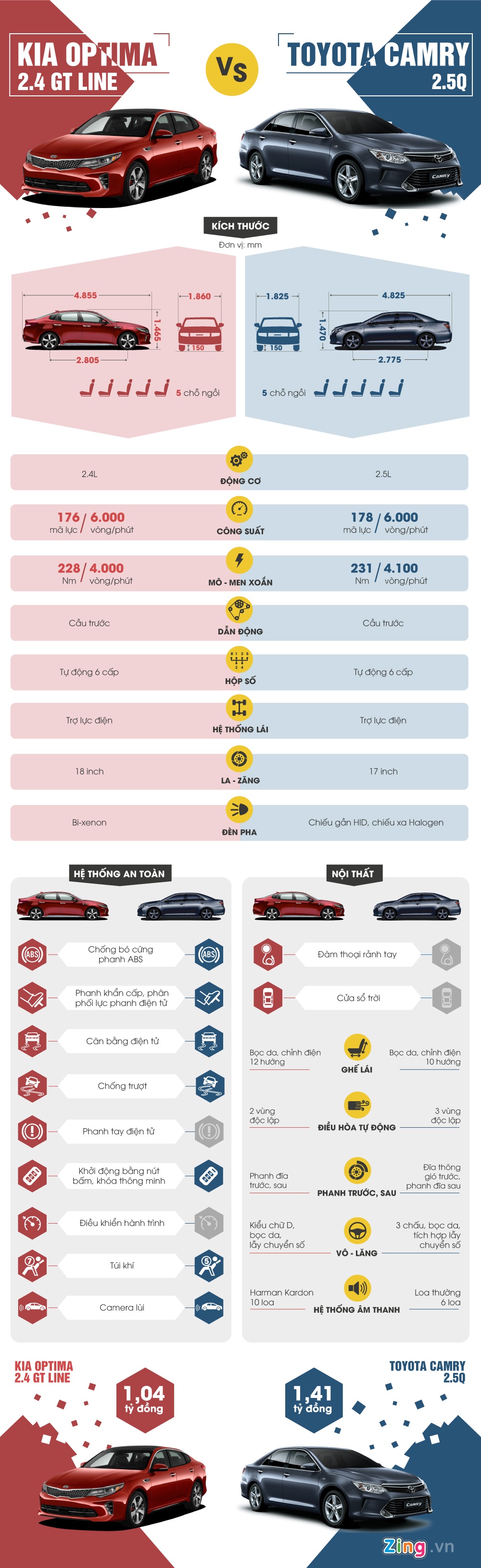 Hai bản cao cấp của Kia Optima và Toyota Camry sở hữu điểm mạnh và điểm yếu riêng. Mức giá của 2 xe cũng chênh nhau đến 400 triệu đồng.