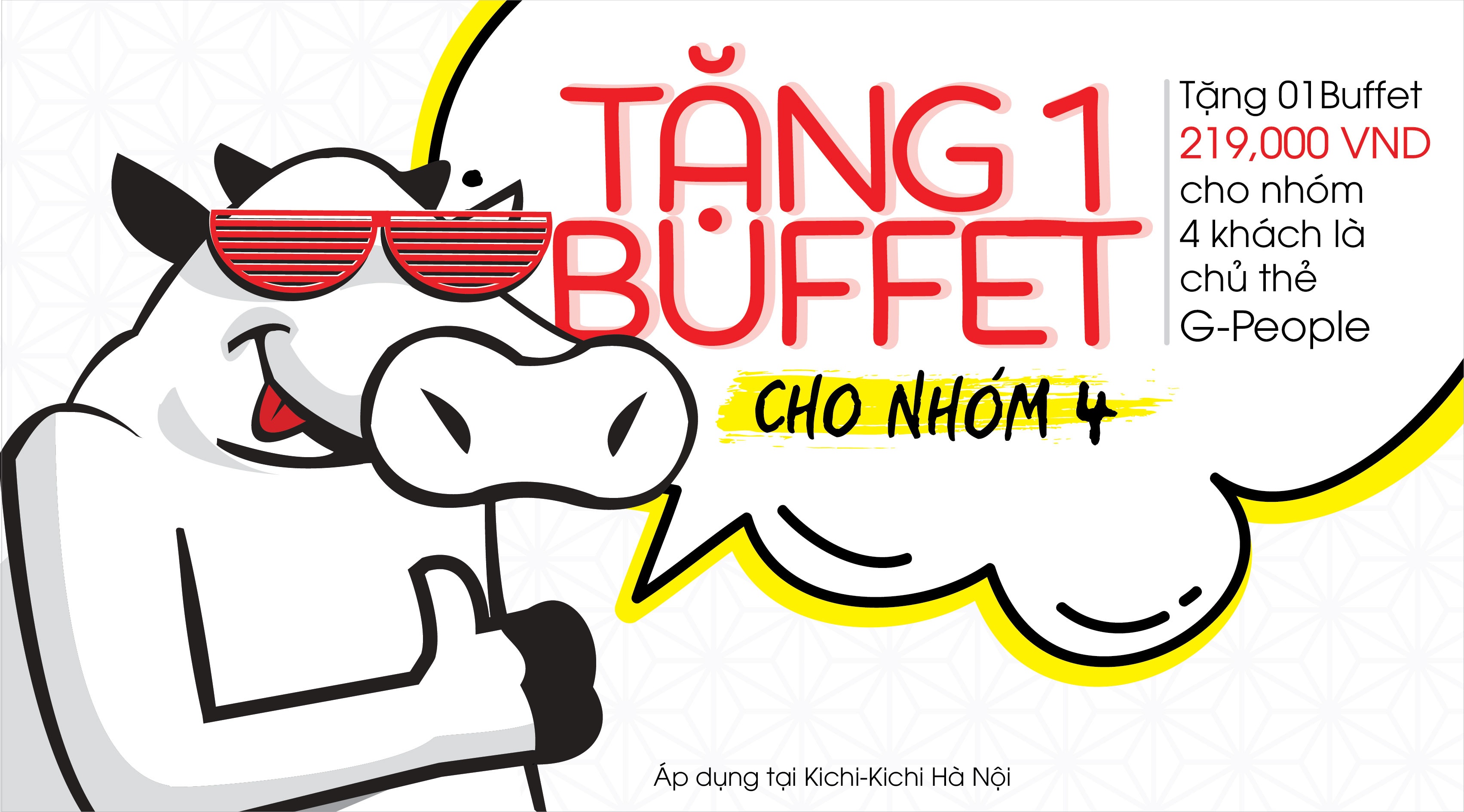 Mùa hè năm nay, Kichi Kichi Hà Nội dành tặng 1 suất buffet miễn phí cho thực khách đi theo nhóm 4 là chủ thẻ G-People. Thực khách không có thẻ G-People sẽ được nhận quà tặng là voucher trị giá 100.000 đồng khi thưởng thức lẩu riêu cua bò Mỹ hoặc 1 trong 5 loại đồ uống mới của nhà hàng như Granita dâu tây, Granita Kiwi, Mojito Classic…