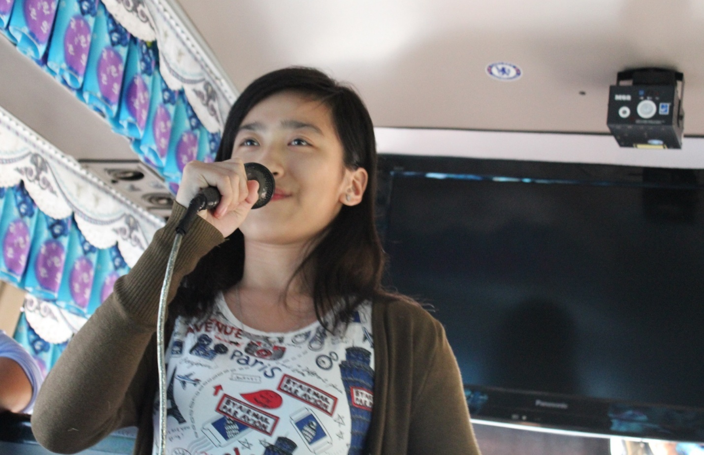 | SV thực hành nghiệp vụ thuyết minh tuyến điểm trên chuyến kiến tập. |