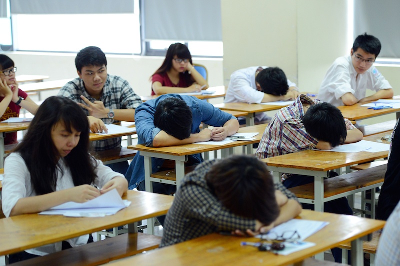 | Tại hội đồng thi ĐH Ngoại thương Hà Nội, các sĩ tử phần lớn đều đổ gục xuống bàn chợp mắt một tí. |