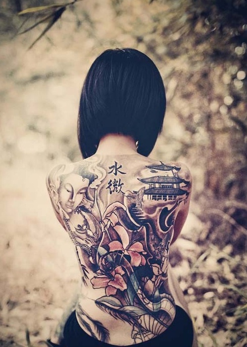 Sau khi suy nghĩ thật kỹ, cô đã quyết định xăm hình ảnh Phật Bà và cảnh chùa chiền Việt Nam, xung quanh có cánh cò, sếu đầu đỏ, hoa gạo, tre trúc, hoa sen của làng quê.