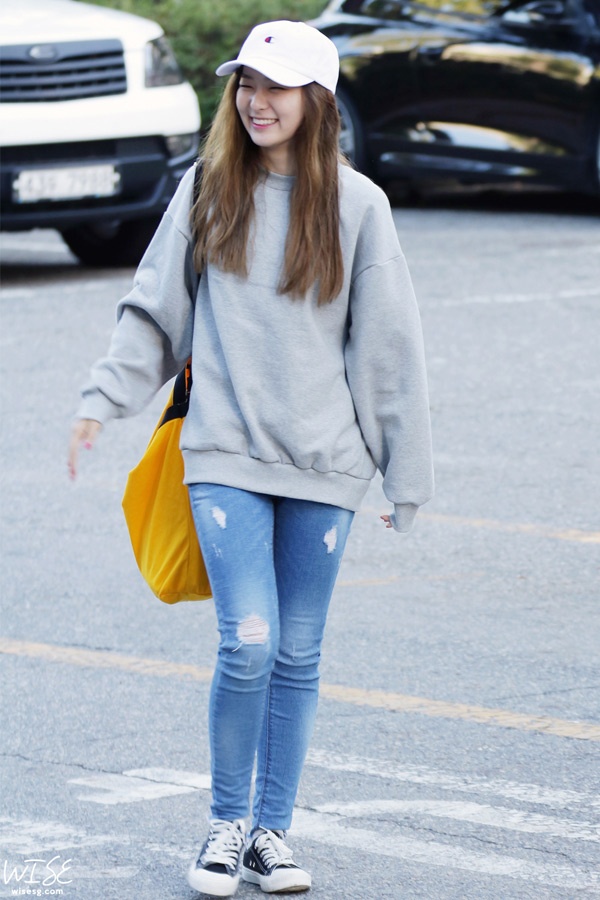 Seulgi chọn sweatshirts để mix thoải mái với loạt item phủi bụi như mũ, quần jean rách và giày converse. |
