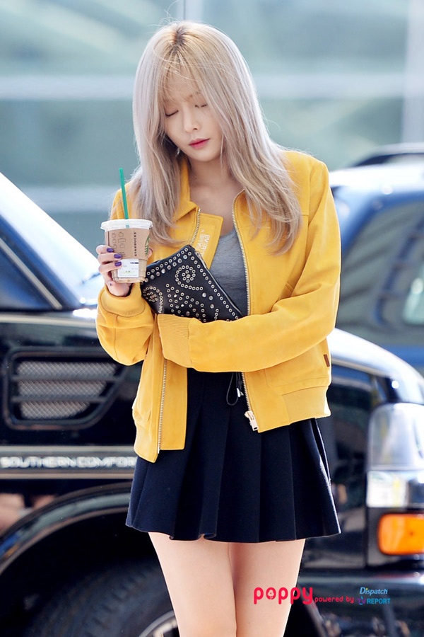 Người đẹp Hyuna hoàn thiện set váy gợi cảm bằng chiếc jacket da bóng, mang gam màu vàng nổi bật. |