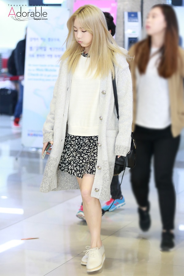 Kid Leader Taeyeon ngày càng nữ tính hơn với áo cardigan và váy hoa giản dị. |