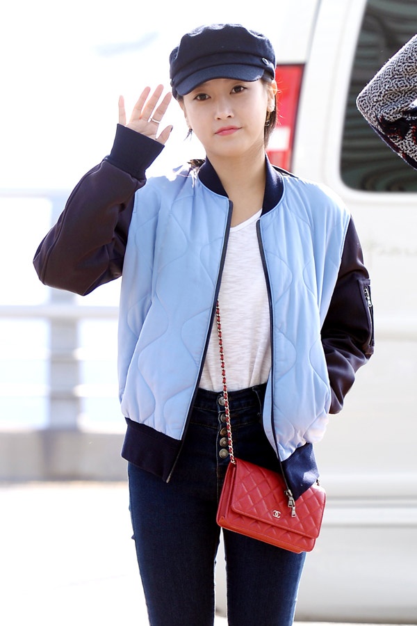 Soyeon làm mới style đơn giản với những phụ kiện điểm nhấn như mũ nồi hay túi xách hàng hiệu. |