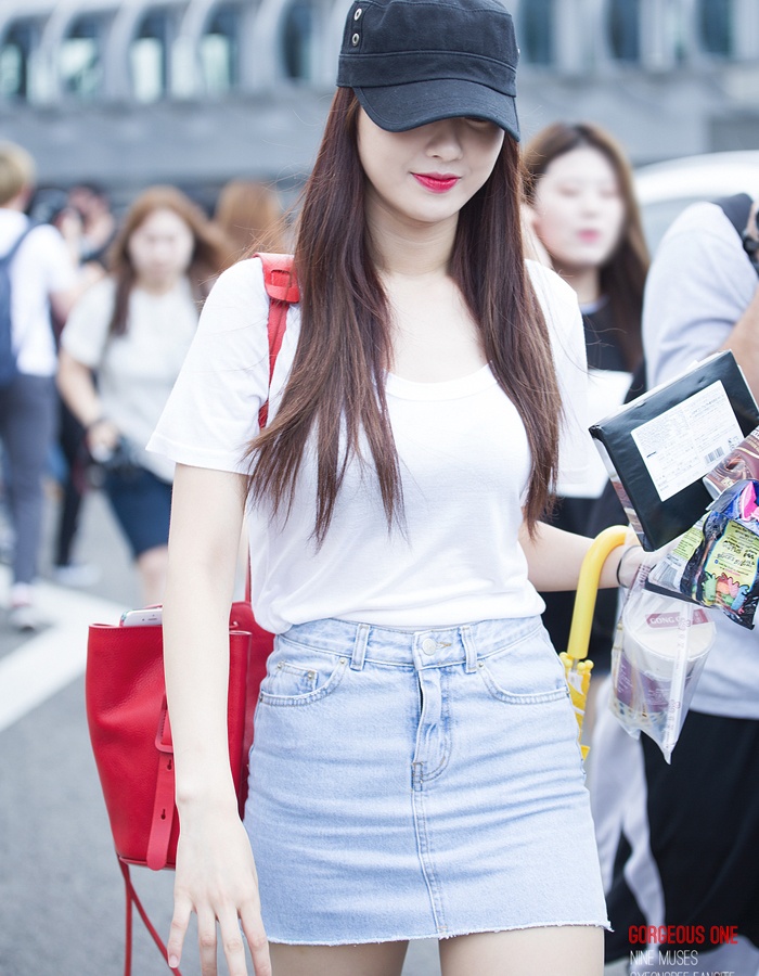 | Chiếc túi xách gam đỏ giúp set váy của Kyungri đã phối đẹp lại càng thêm "chất chơi". |