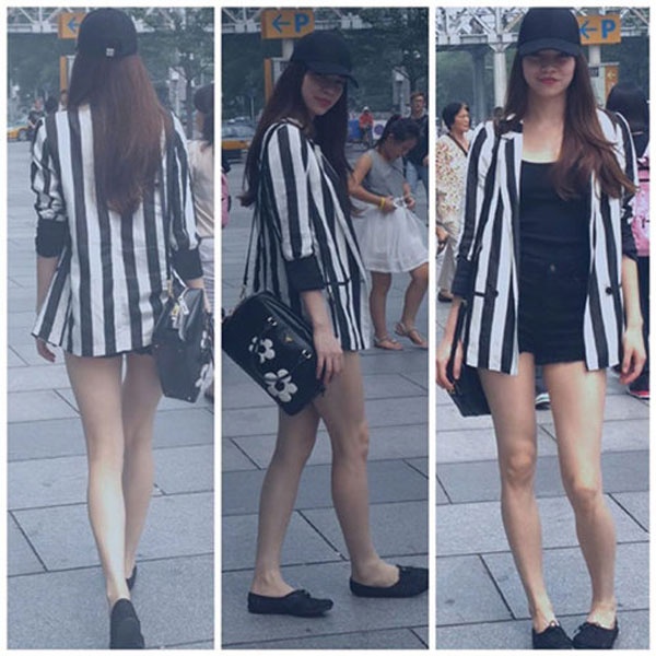 | Hồ Ngọc Hà tự tin với quần short ngắn và áo khoác kẻ sọc. |