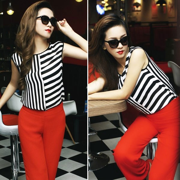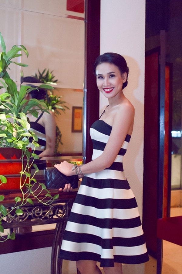 | Thanh Hằng là tín đồ của thời trang kẻ sọc nhưng mỗi lần diện cô đều thể hiện một vẻ đẹp mới lạ và quyến rũ. |