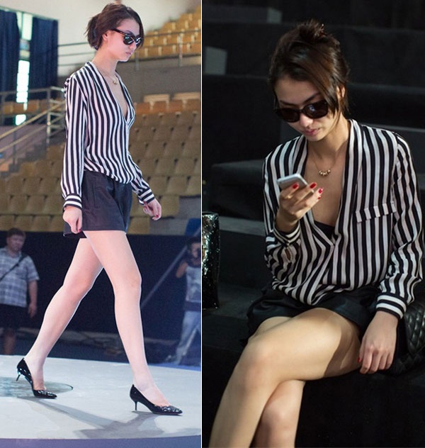 | Hồng Quế phô diễn đôi chân dài trong chiếc áo kẻ sọc và quần short. |