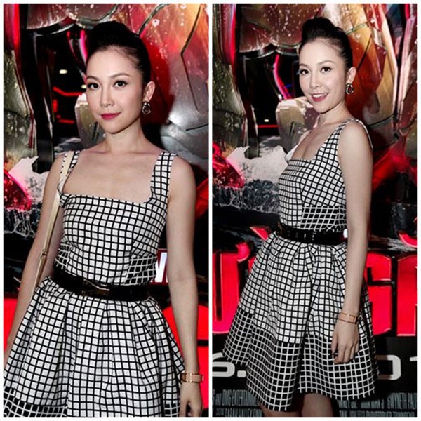 | Lưu Thiên Hương trẻ trung hơn với chiếc váy xoè kẻ trắng đen. |