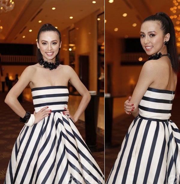 | Huyền Ny lộng lẫy trong chiếc váy kẻ bồng bềnh. |