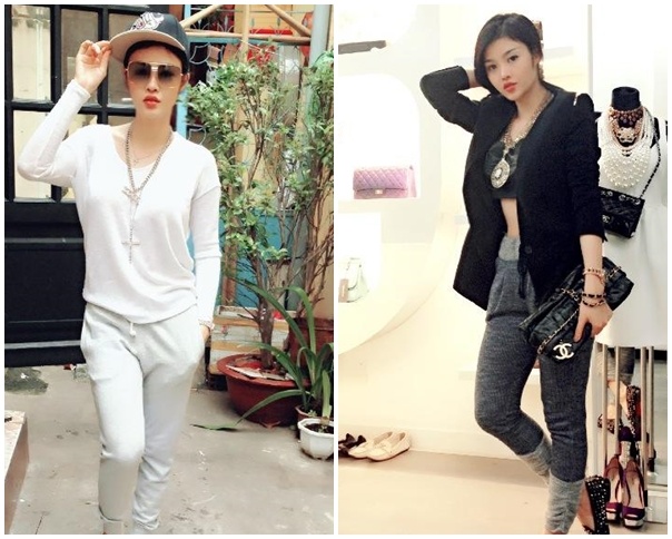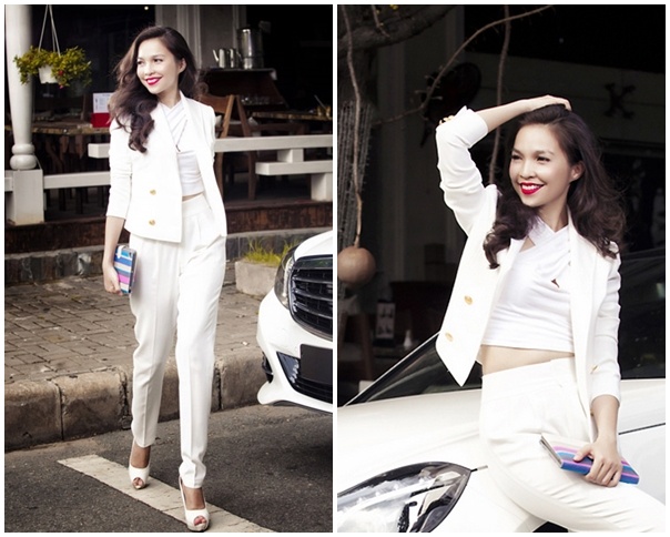 Hiền Thục chọn trang phục tông màu trắng, vest bộ khá hiện đại và thanh lịch, từ áo thun, quần, giày đều đi chung một gam màu rất đồng bộ.