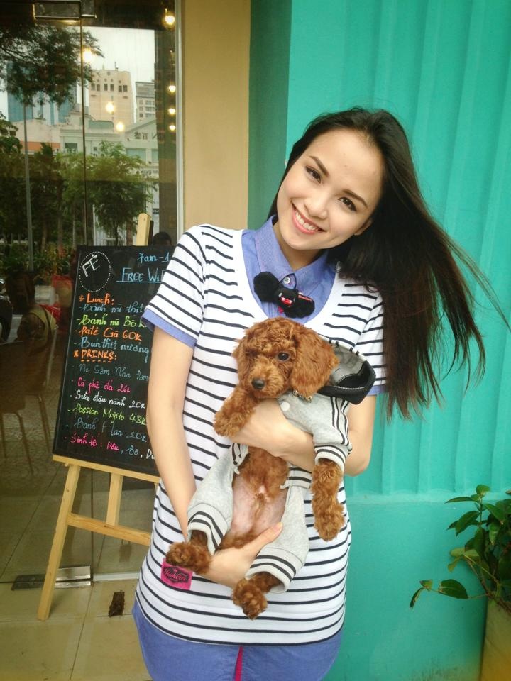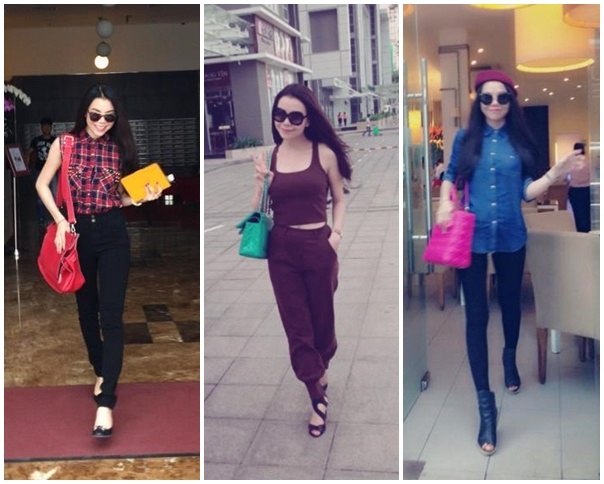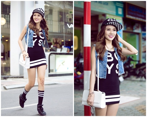 Hoa hậu Diễm Hương trẻ trung với phong cách rất đời thường cùng jean và áo thun sọc kẻ, cách kết hợp thông dụng và trẻ trung.