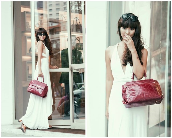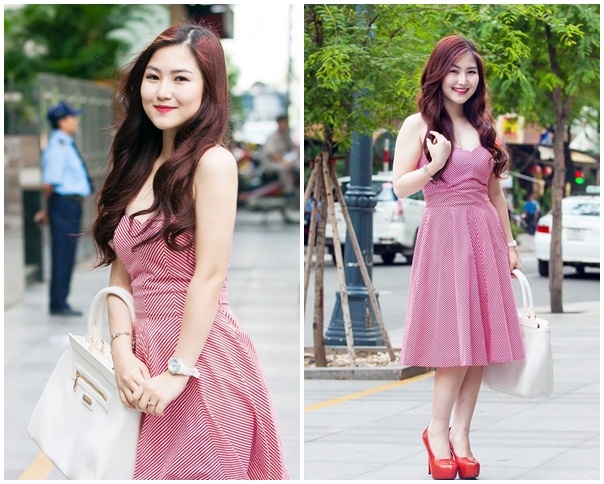 Hà Anh có phần nữ tính và duyên dáng với váy dài thanh thoát khi dạo trên một con phố Sài Gòn. Dáng người dong dỏng cao giúp cô dễ dàng phù hợp với nhiều phong cách.