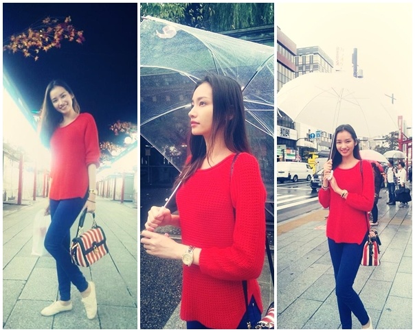 Hoa hậu Trúc Diễm chọn trang phục đời thường áo thun nhẹ và quần jeans khi đi dạo trên một con phố sầm uất của đất nước mặt trời mọc.