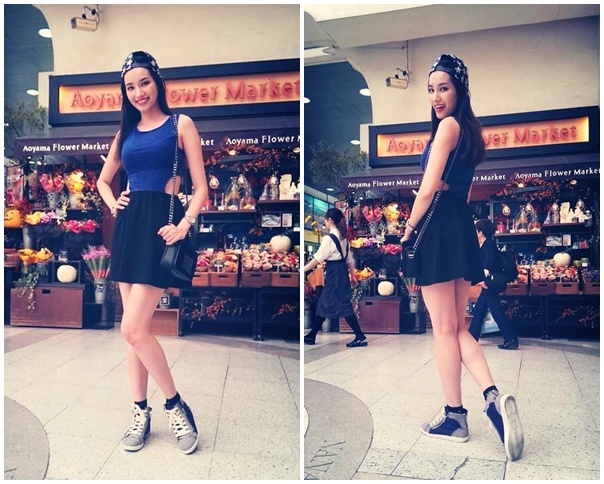 Ngày hôm sau, cô chọn gu thời trang hiện đại với váy khoét hông, giày bata trẻ trung.