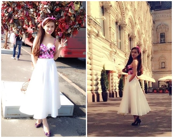 Hotgirl Kelly trên một con phố với phong cách nữ tính với váy xòe cổ điển, thân áo in hoa nền nã và nữ tính.