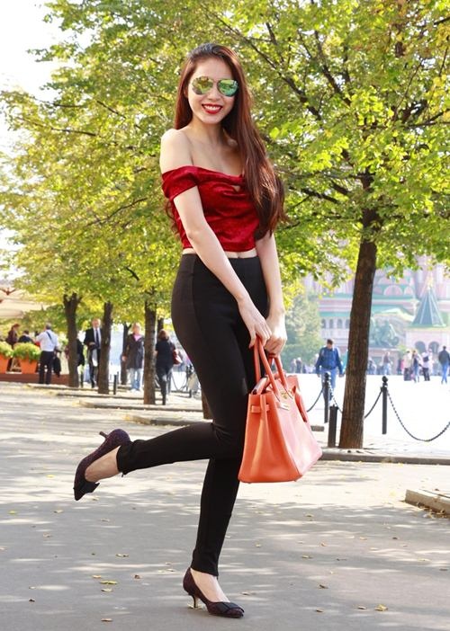 Ca sĩ Thủy Tiên nữ tính và gợi cảm với mẫu áo trễ vai, quần thun ôm sát, đôi giày gót thấp rất năng động.