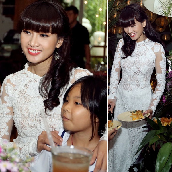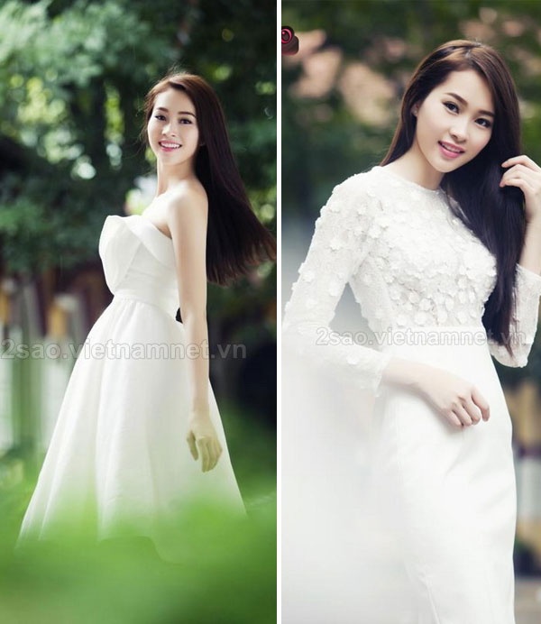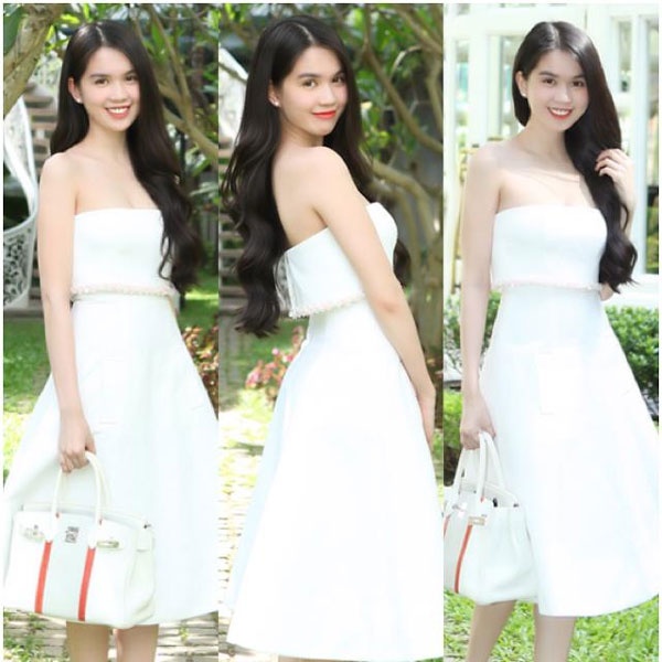 | Vốn sở hữu làn da trắng, gương mặt thơ ngây nên Ngọc Trinh càng rạng rỡ hơn với những thiết kế đầm trắng. |