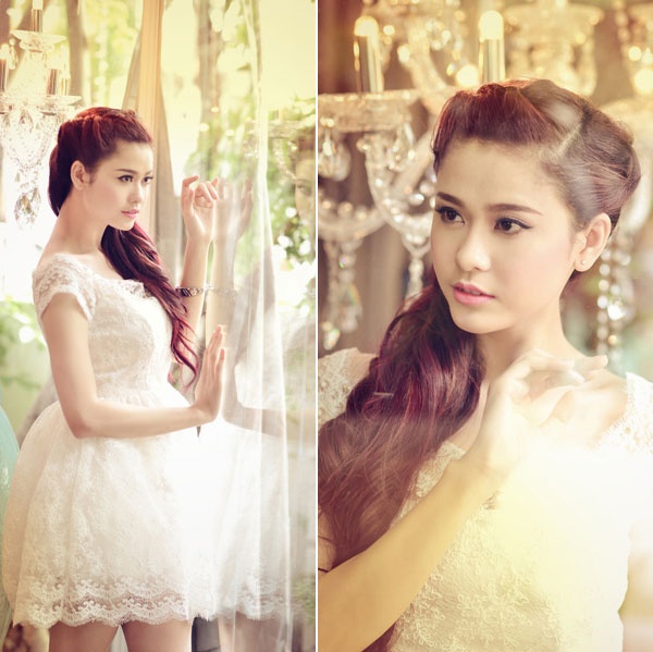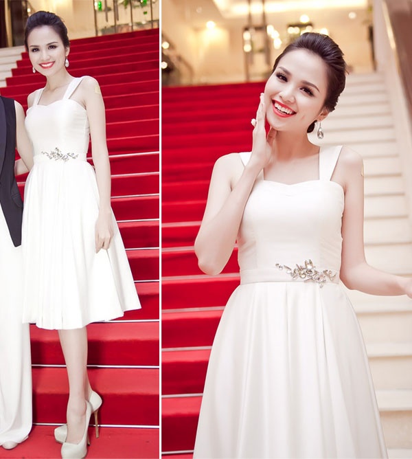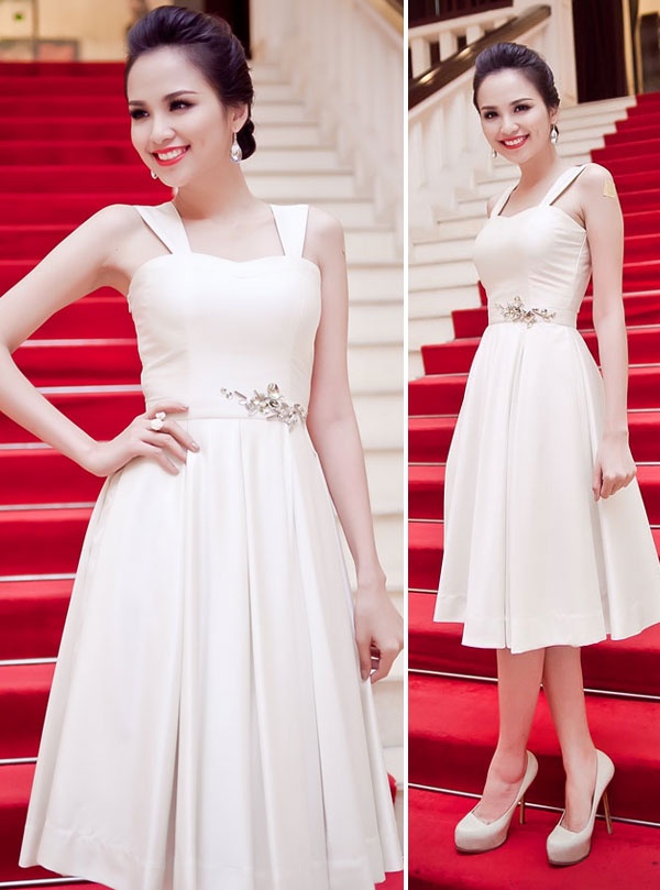 | Hoa hậu Đặng Thu Thảo mang vẻ đẹp mong manh dịu dàng nên khi mặc những chiếc váy màu trắng thì cô càng toát lên được sự ngây thơ, trong trắng. |