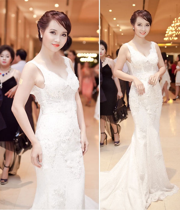 | Mai Thu Huyền thực sự cuốn hút khi diện đầm đuôi cá màu trắng trang trí ren cầu kỳ. |