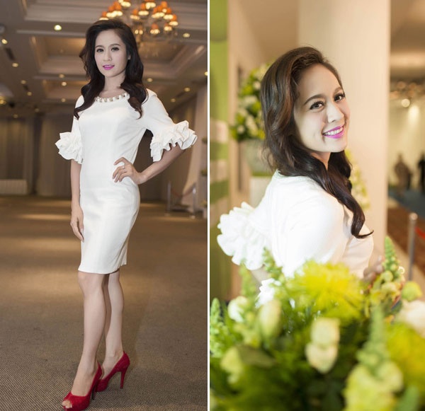 | Thanh Thuý tinh ý kết hợp váy trắng thiết kế bèo dúm ở hai tay với giày cao gót đỏ cùng mái tóc xoăn nhẹ nhàng tự tin tạo dáng trước ống kính. |