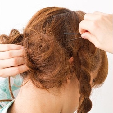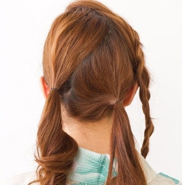 | Cố đính lọn tóc tết với chun cùng màu tóc. Sau đó, chia toàn bộ phần tóc còn lại thành 2 phần, buộc thành 2 lọn như hình vẽ. |