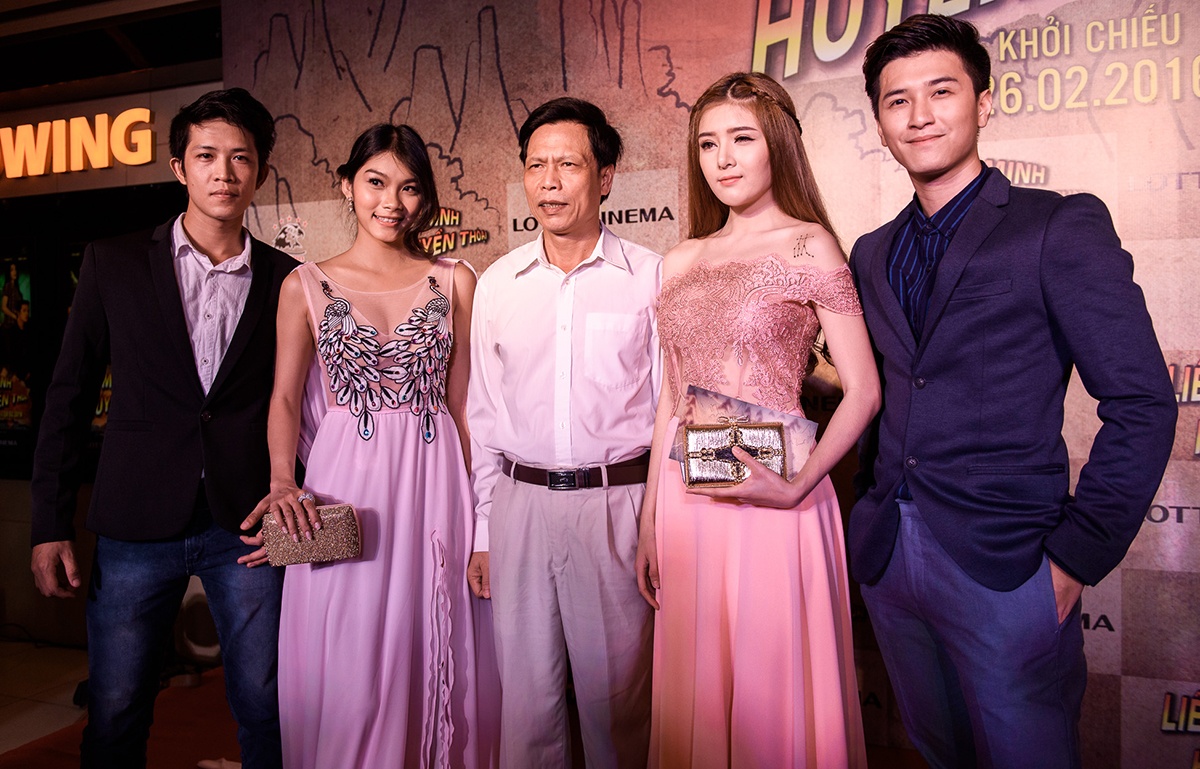 Nhà sản xuất Phạm Văn Hải (giữa) chụp hình cùng dàn diễn viên trẻ. Theo tiết lộ của ông, các thành viên trong đoàn phim đã bỏ tiền để sản xuất bộ phim này vì trong giai đoạn khởi quay, ông gặp khó khăn về tài chính. Ông Văn Hải cũng khẳng định Liên minh huyền thoại không chạy theo thể loại hài nhảm. |