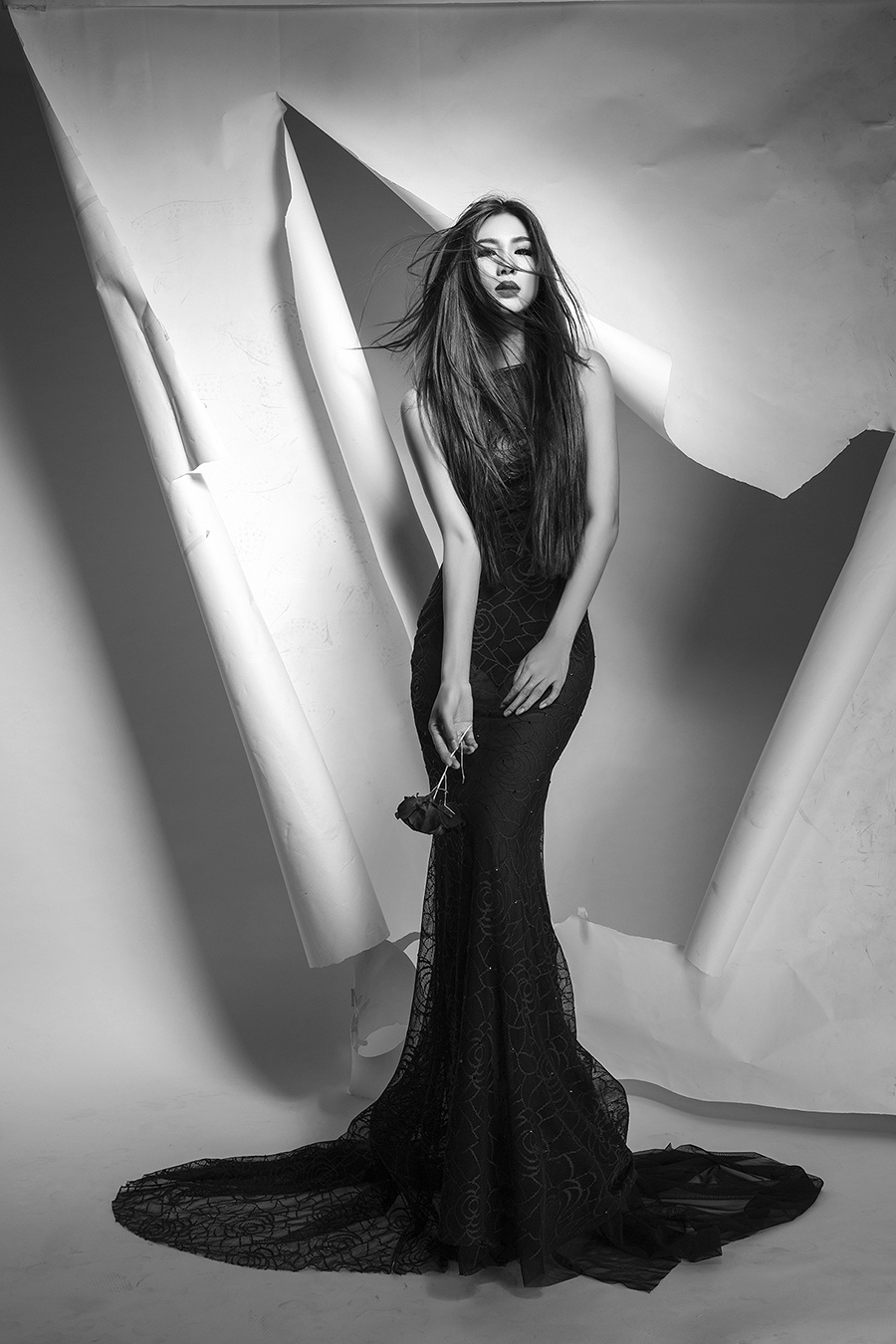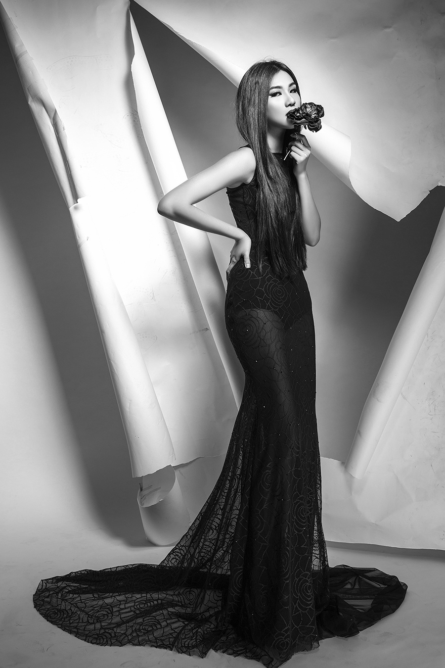 | Ngoài chất vải lưới, tông trắng sang trọng, Kim Dung còn thể hiện một số mẫu váy gam đen tuyền, chất vải voan in họa tiết hoa hồng huyền bí, làm tăng vẻ đẹp quyền quý của người mặc. |