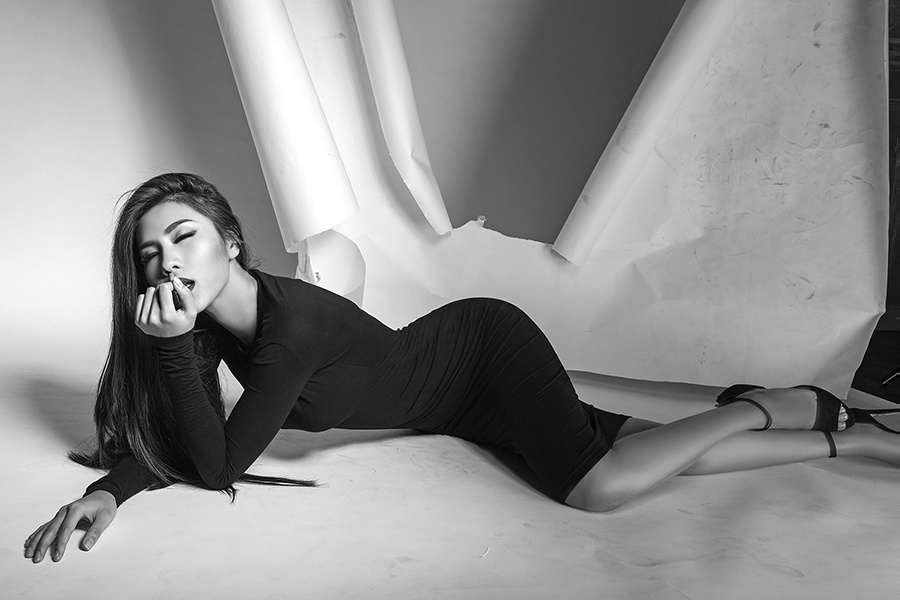 | Bên cạnh dáng váy dài, nữ diễn viên - người mẫu còn diện những dáng váy ôm sát, ngắn ngang gối. Cách tạo dáng sang tạo và biểu cảm sinh động giúp hình ảnh thêm phần cuốn hút. |