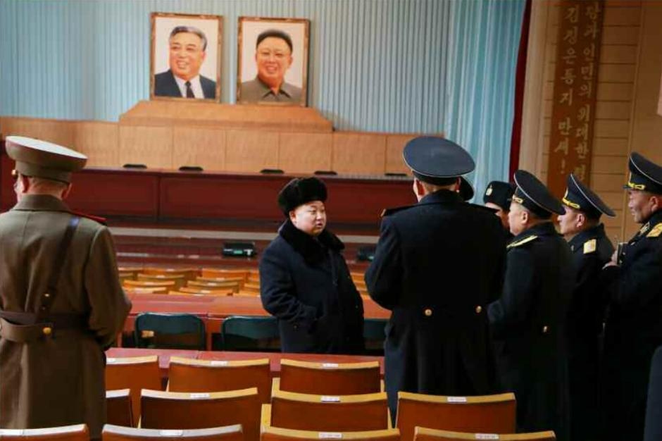 Ông Kim cũng kiểm tra hội trường, nơi hai bức di ảnh của nhà lãnh đạo Kim Nhật Thành (trái) và Kim Jong Il được treo ở vị trí trang trọng.