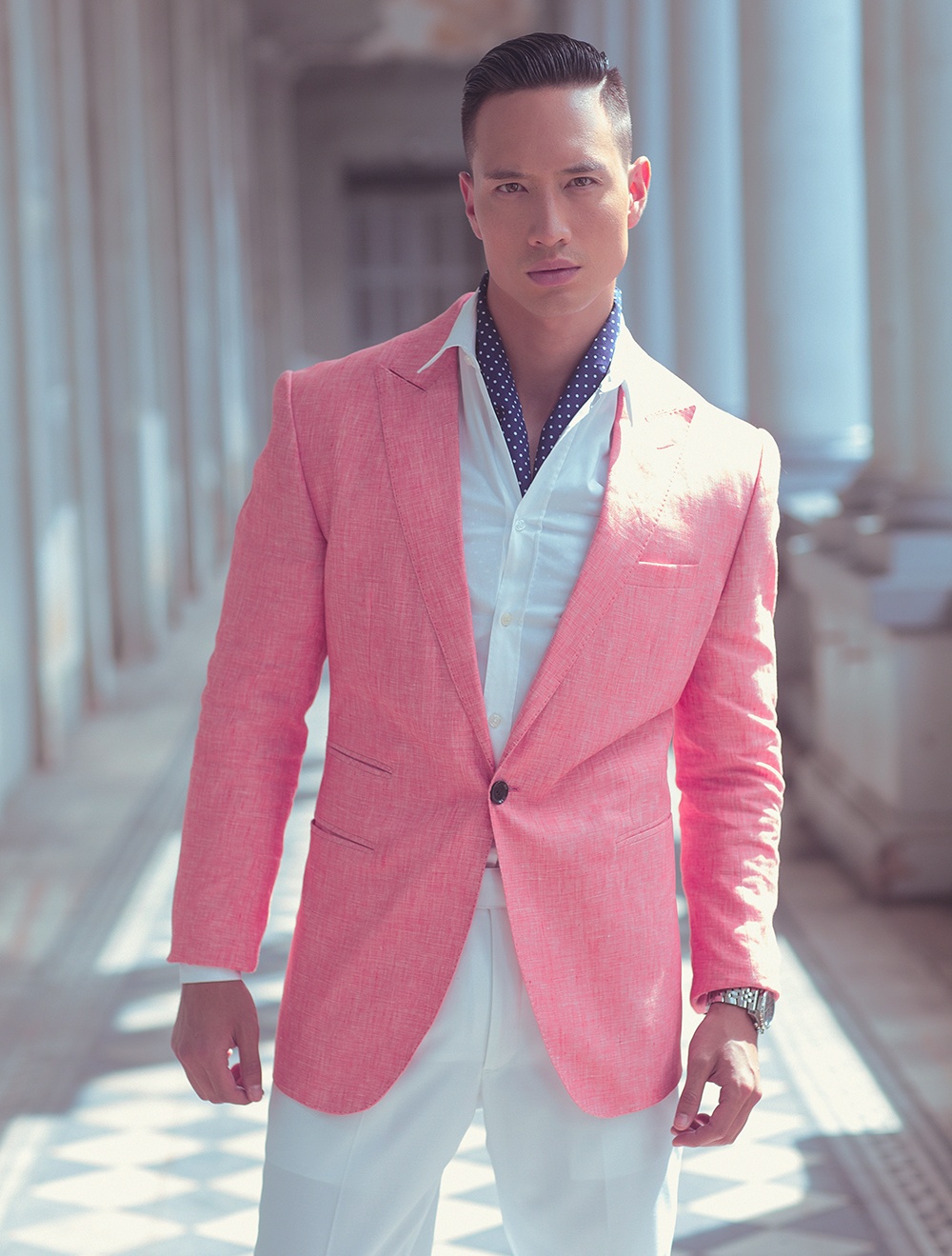 Áo vest tông hồng giúp nam diễn viên trở nên ngọt ngào và phóng khoáng.