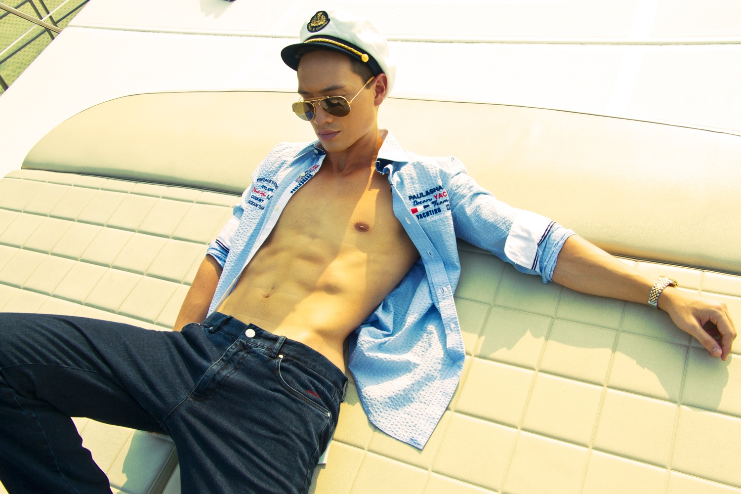 Bối cảnh thực hiện bộ ảnh mới của Kim Lý được tổ chức ngay trên du thuyền sang trọng của gia đình nữ diễn viên - doanh nhân Thủy Tiên (mẹ chồng Tăng Thanh Hà). Tiết trời nắng ấm với dòng nước trong xanh của sông Sài Gòn càng làm tăng vẻ rắn rõi, lãng tử của Kim Lý.