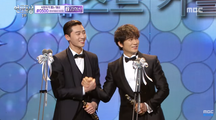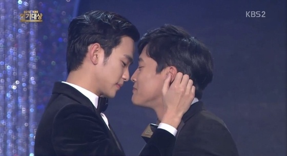 | Kim Soo Hyun và đàn anh Cha Tae Hyun thể hiện cảnh tình tứ tại lễ trao giải của đài KBS. |