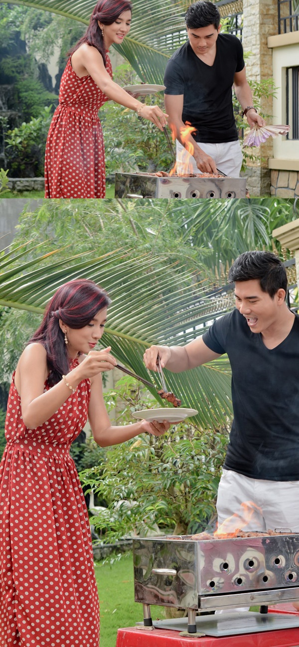 | Tại sân vườn một ngôi biệt thự ở ngoại ô, Kim Tuyến và Thành Được vui vẻ cùng nướng BBQ. |