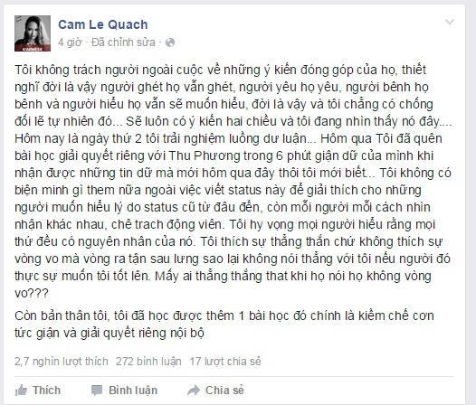- Những dòng chia sẻ đầu tiên của tôi chỉ tồn tại trong vòng 6 phút và đó chỉ là một cơn nóng giận tức thời. Ngay sau đó, tôi nghĩ mình nên bình tĩnh lại. Tôi xóa đi dòng chia sẻ gay gắt đó và gửi tin nhắn cho chị Thu Phương. Tôi không ngờ rằng có người đã chụp ảnh màn hình những điều tôi chia sẻ và gửi lên báo chí.