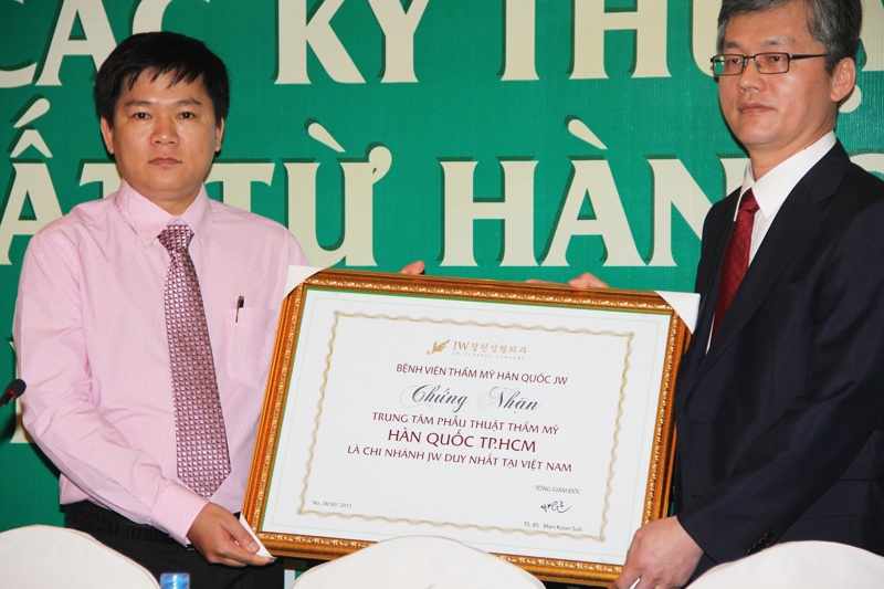 | Viện trưởng bệnh viện thẩm mỹ Hàn Quốc JW trao chứng nhận trung tâm phẫu thuật thẩm mỹ Hàn quốc JW. Đây là chi nhánh duy nhất của bệnh viện thẩm mỹ Hàn Quốc JW tại Việt Nam. |
