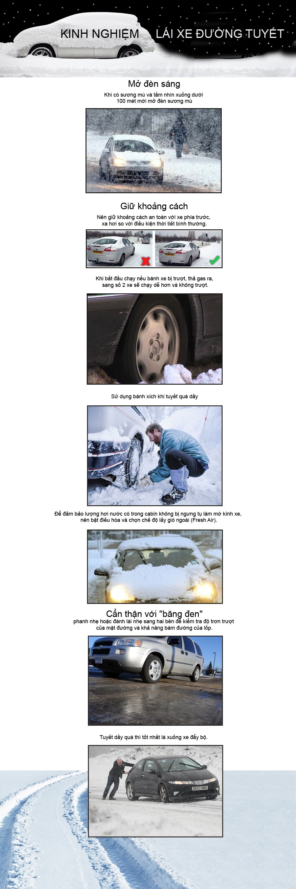 Những vật dụng nhất thiết cần mang theo xe khi đi vào vùng băng tuyết - Bình xăng đầy - Nước Anti Freeze (nước Coolant) dự trữ. - Lốp xe dự trữ đủ hơi, bộ kích xe, dây câu bình sạc điện, dây kéo xe, dụng cụ sửa xe thiết yếu. - Xẻng, chổi, dao, dụng cụ cào tuyết. - Một túi lớn muối, cát, hoặc rơm lót. - Túi cứu thương, kéo, dây thừng, diêm, compass. - Đèn pin đủ điện cùng pin dự phòng. - Chất đốt khô (nến, cồn khô) - Đồ ăn khô, nước uống, nước dinh dưỡng. - Găng tay, áo ấm, chăn. |