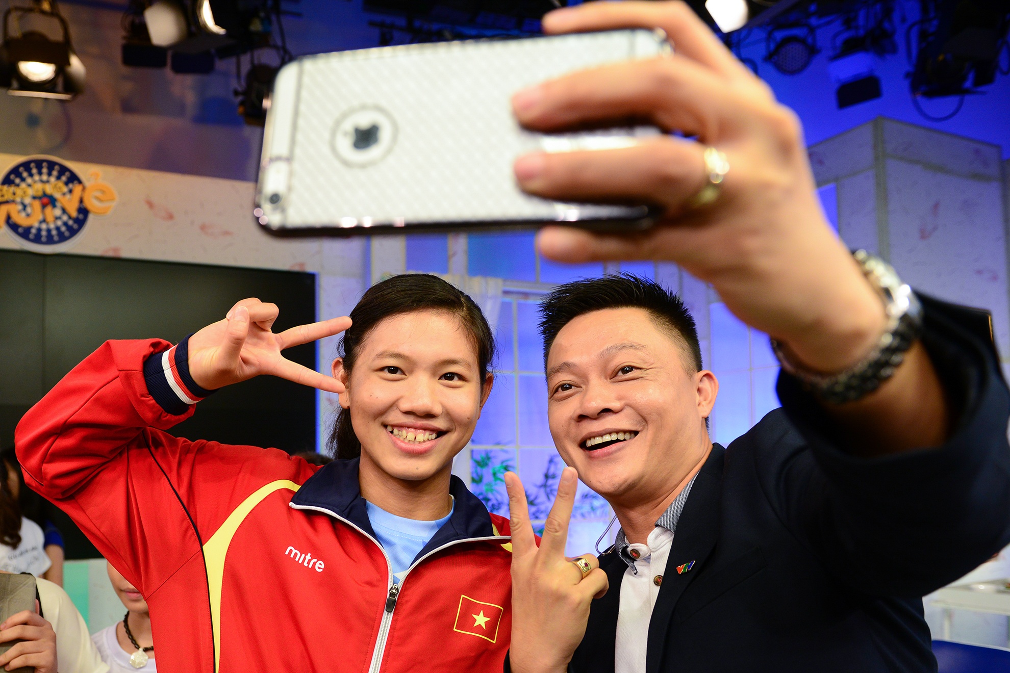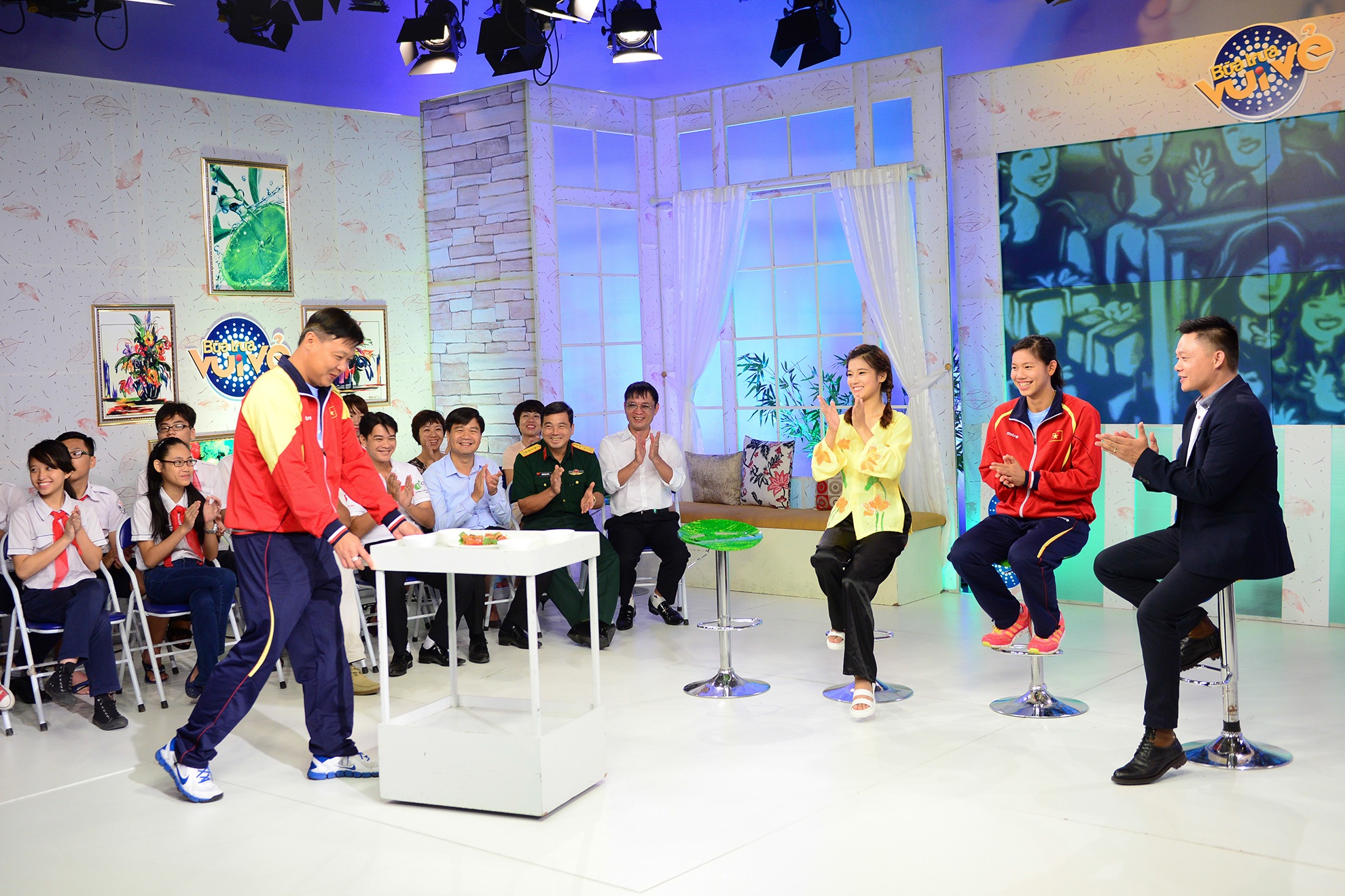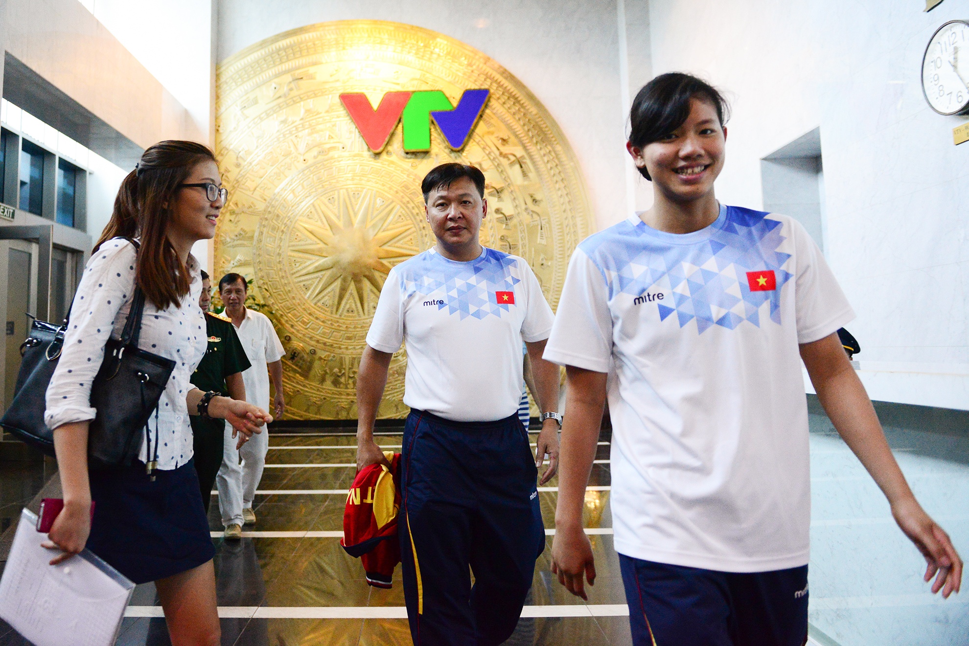 11h15, Ánh Viên và HLV Đặng Anh Tuấn có mặt tại đài truyền hình Việt Nam để chuẩn bị cho buổi giao lưu, tương tác với khán giả VTV. Người mẫu Trang Trần, dù đang mang bầu, bất ngờ có mặt để hộ tống kình ngư Nguyễn Thị Ánh Viên.
