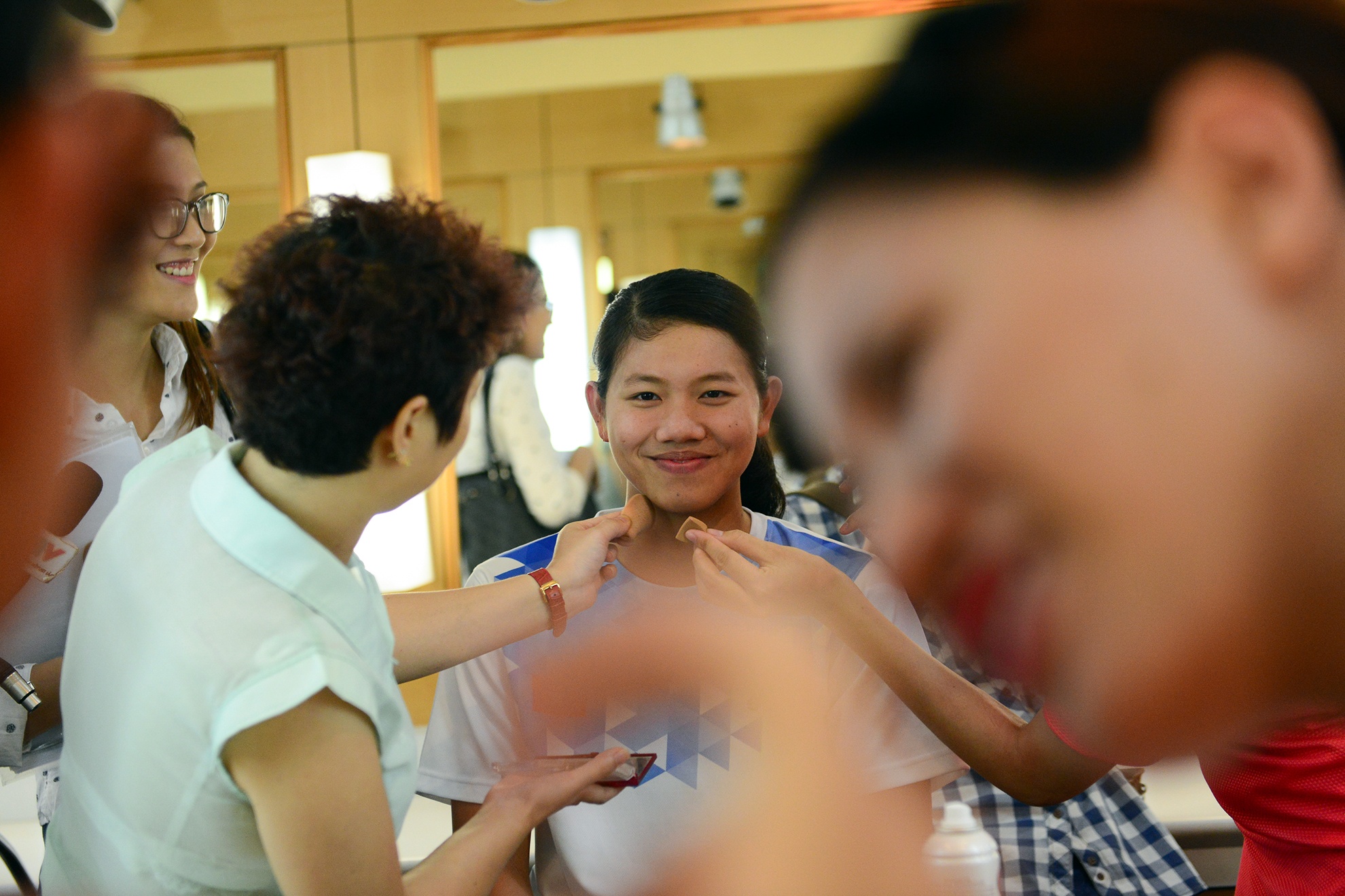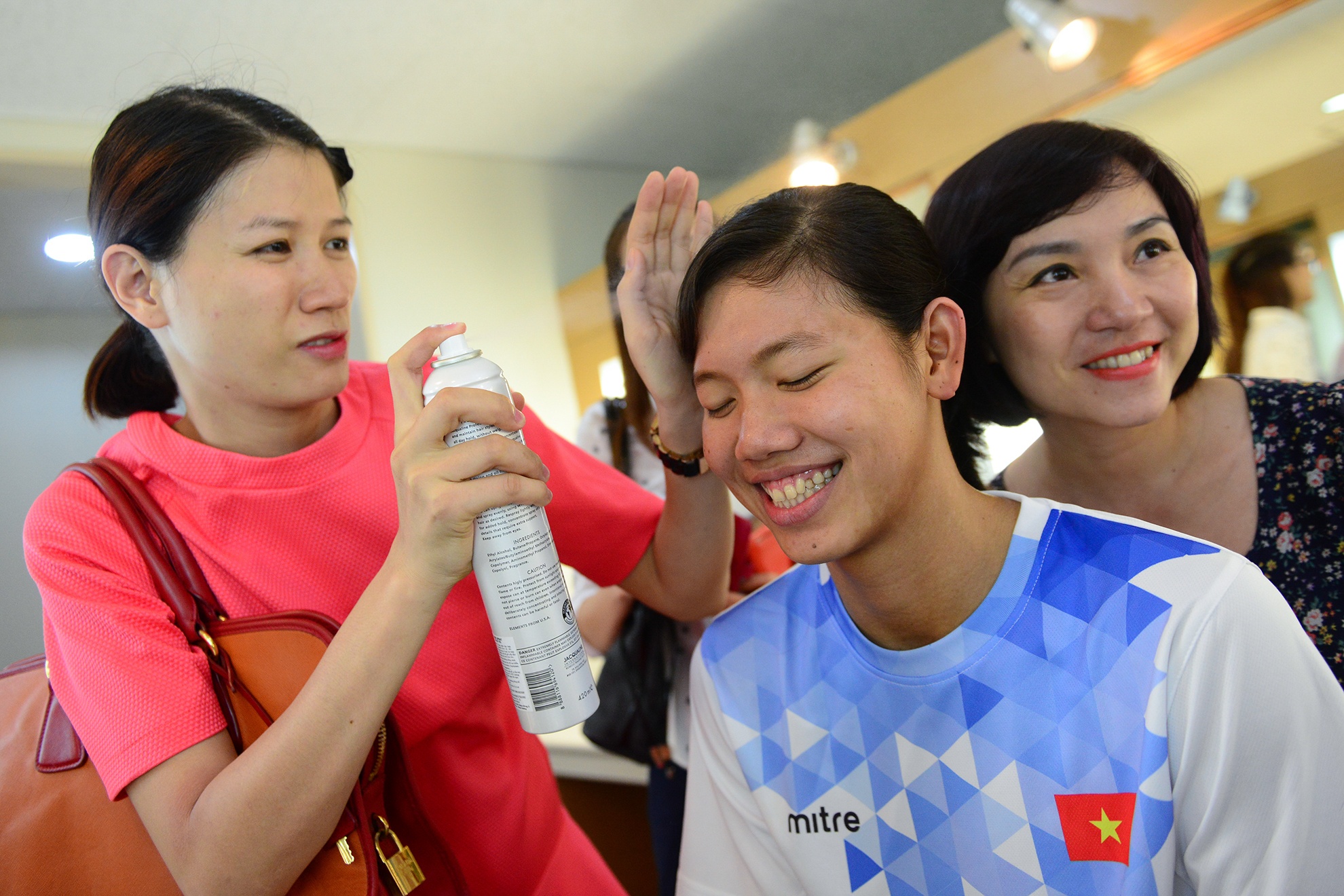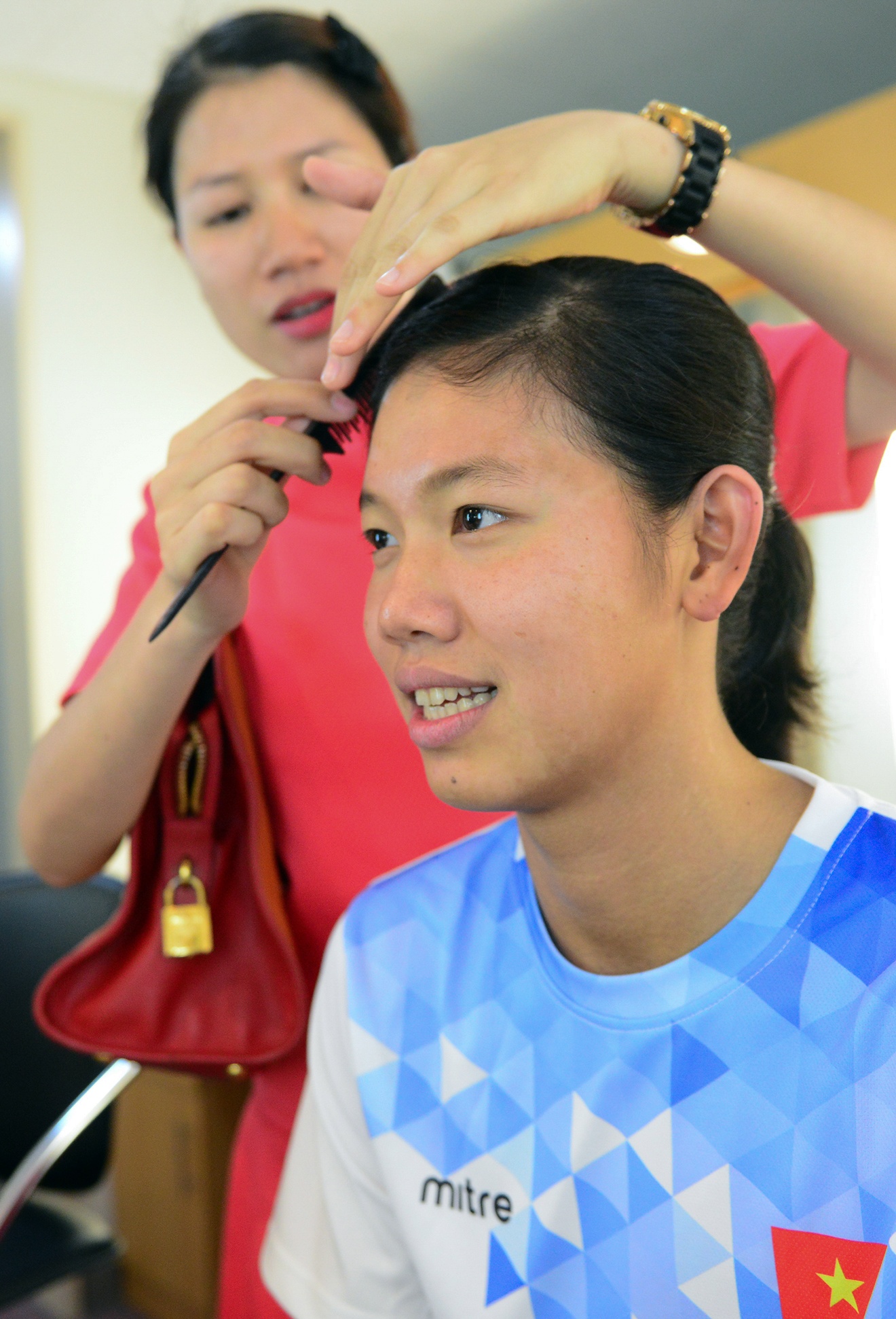 Sau khi tới nhà đài, Ánh Viên nhanh chóng di chuyển tới phòng trang điểm. Tại đây, 9X chải lại tóc, đánh chút son và trang điểm cực nhẹ trước khi lên hình.
