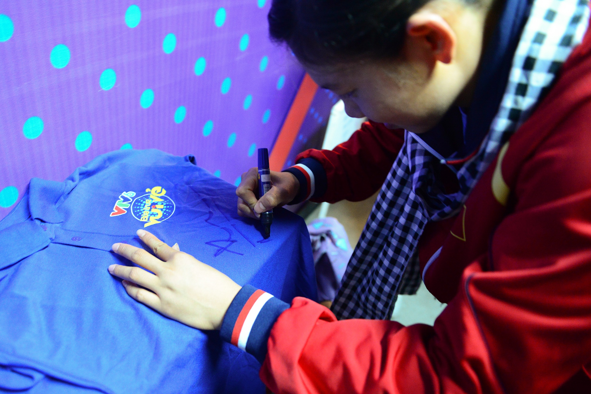 Cô tranh thủ ký tặng lên áo kỷ niệm của chương trình Bữa trưa vui vẻ. Kình ngư cũng mang tới món quà của riêng mình, dành cho khán giả của VTV6, là một chiếc áo với hình ảnh, chữ ký và dòng chữ "Niềm tự hào Việt Nam".