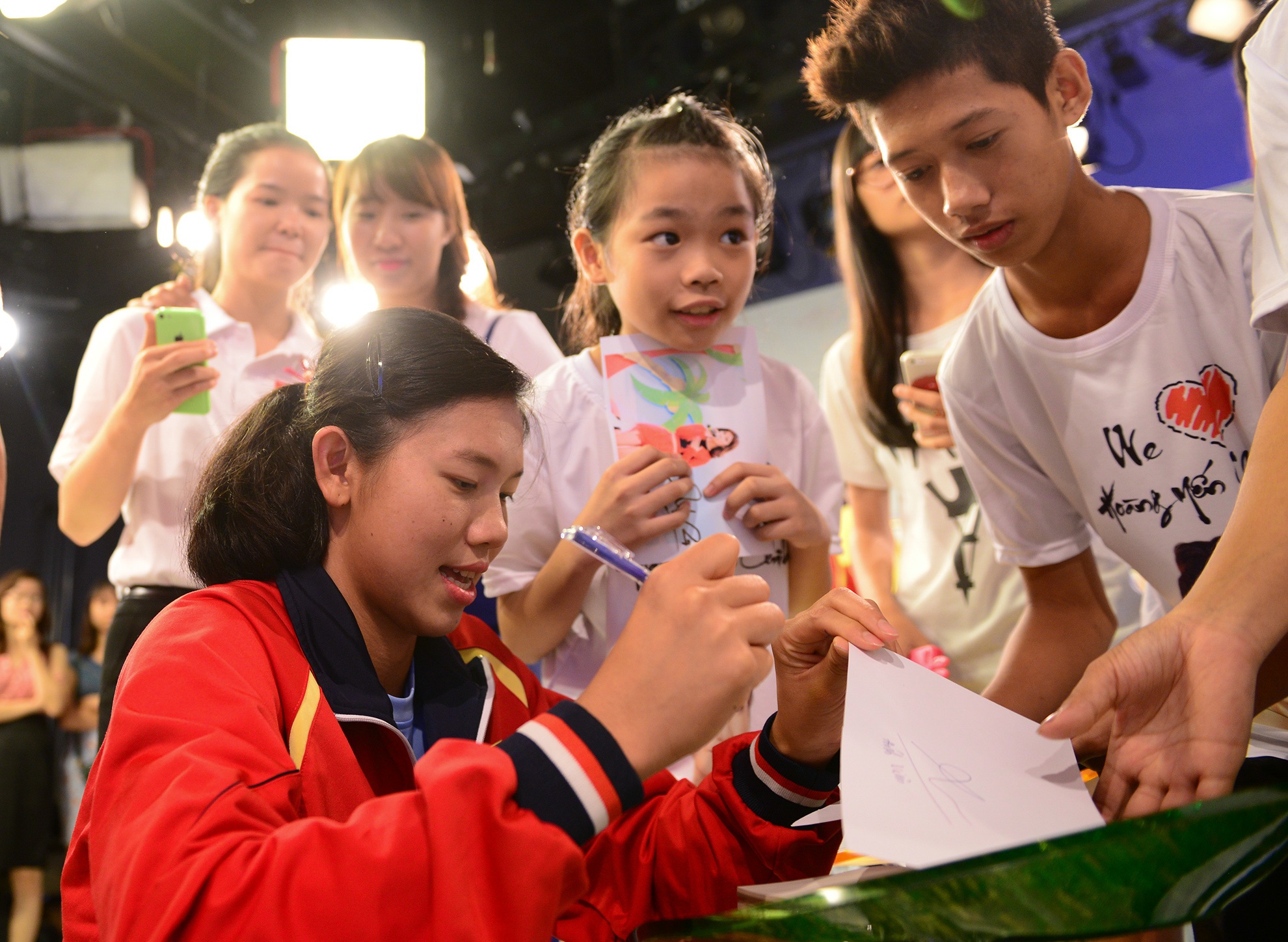 Cô nán lại để ký tặng cho người hâm mộ trước khi ra về. Trở thành niềm tự hào của đất nước và tấm gương sáng để thế hệ trẻ noi theo và học tập, Ánh Viên liên tiếp xuất hiện trong đề thi Ngữ văn thời gian qua.