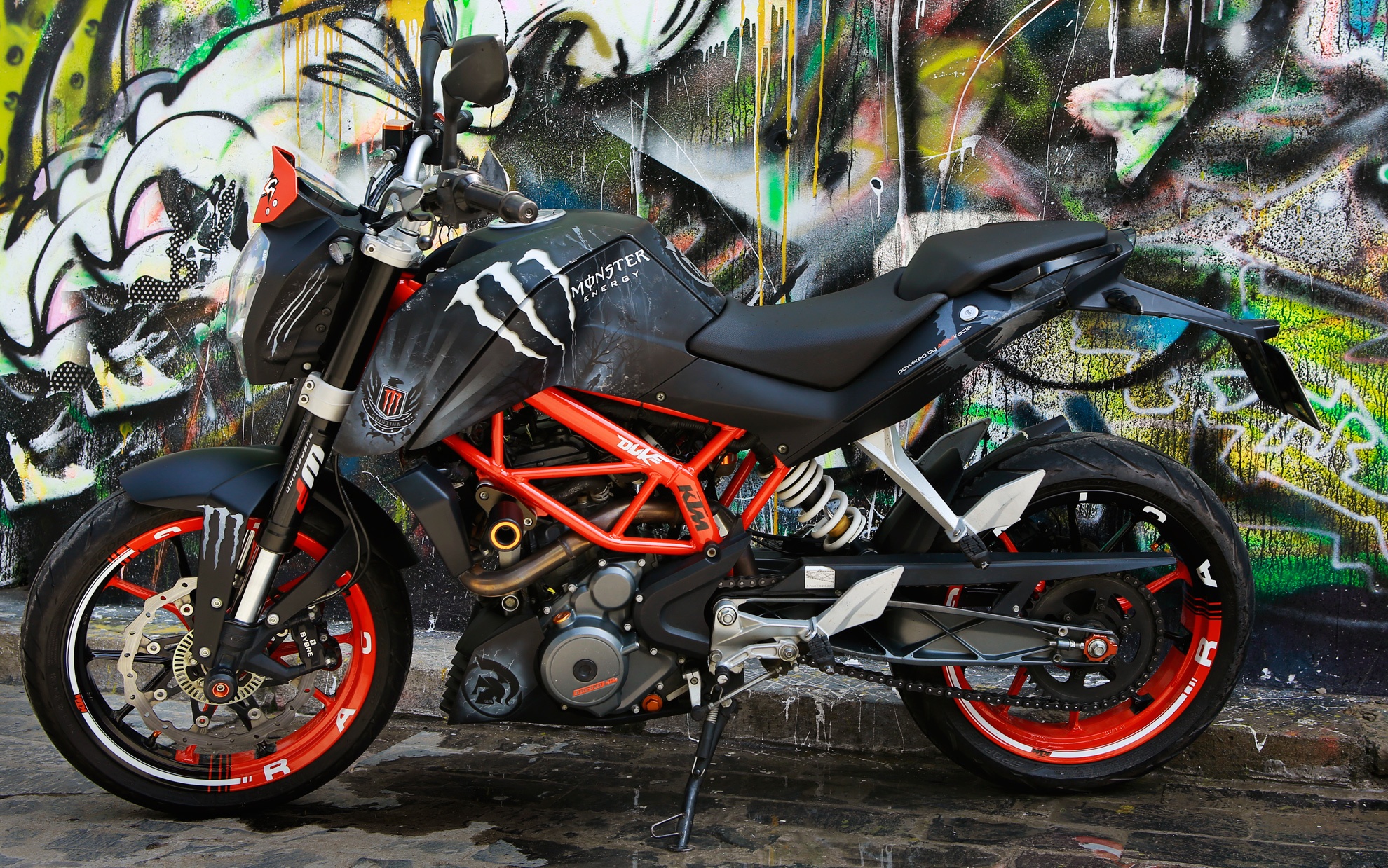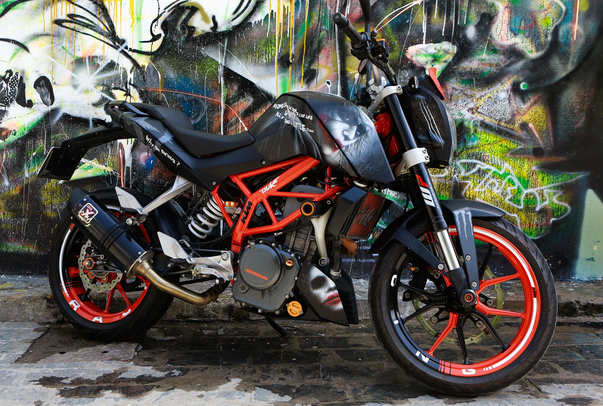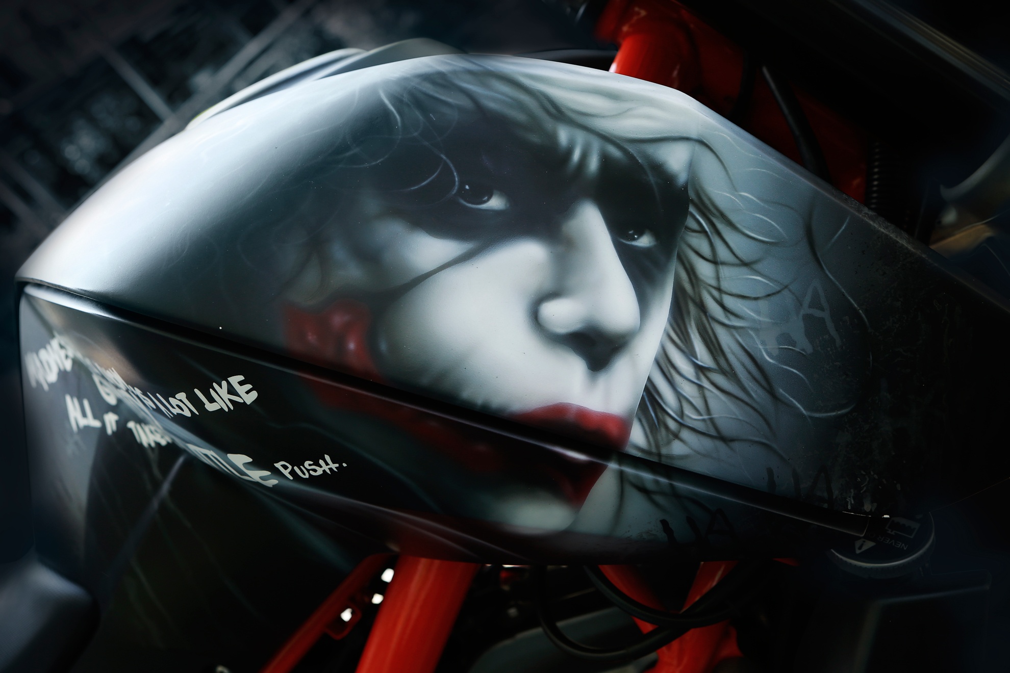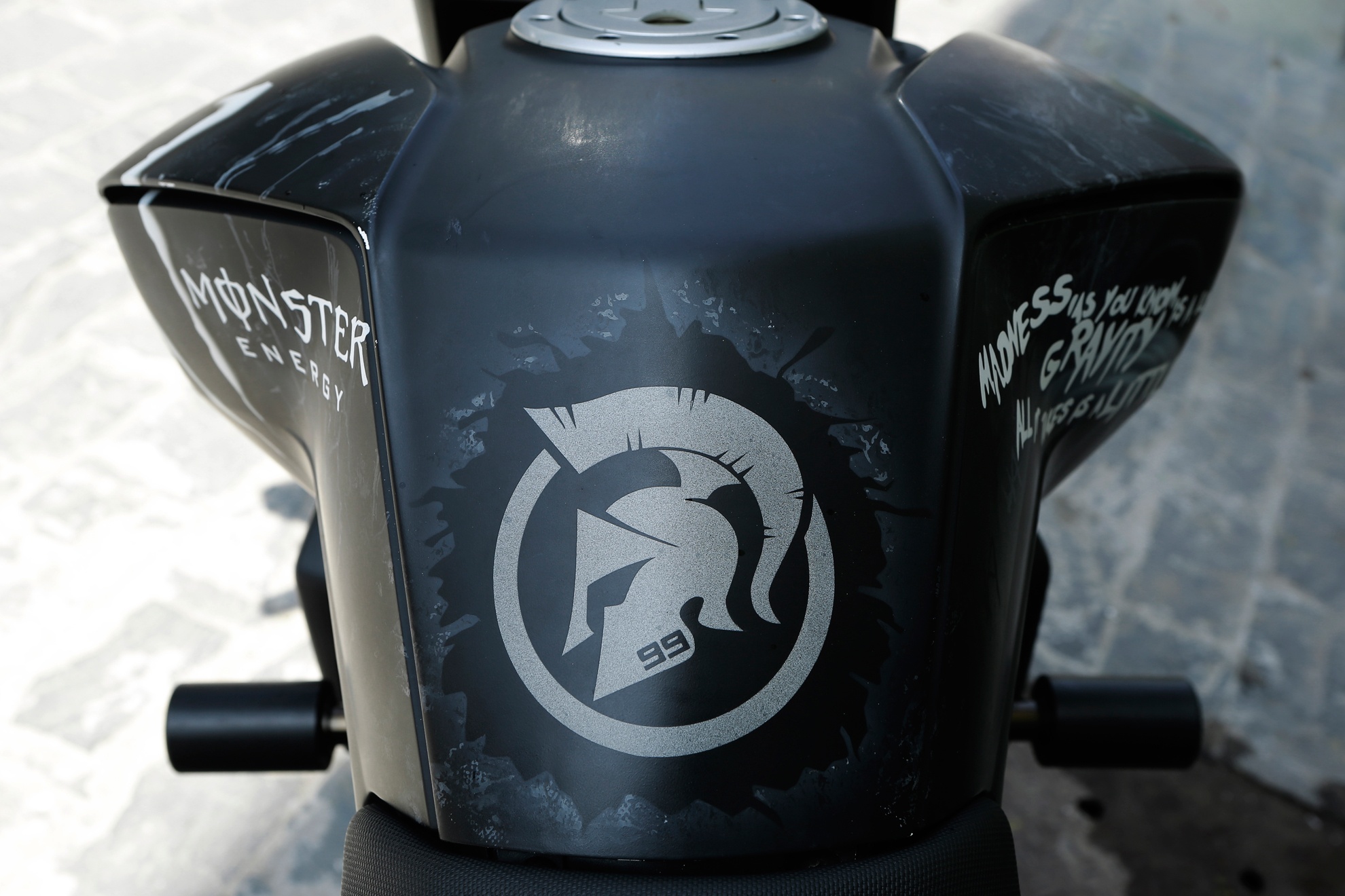 | Chiếc KTM Duke 390 độ lại phong cách tự do theo tinh thần của nhân vật Joker trong bộ phim Hiệp sỹ bóng đêm - biểu tượng cho sự nổi loạn, tính chiều sâu đầy ẩn ý. |