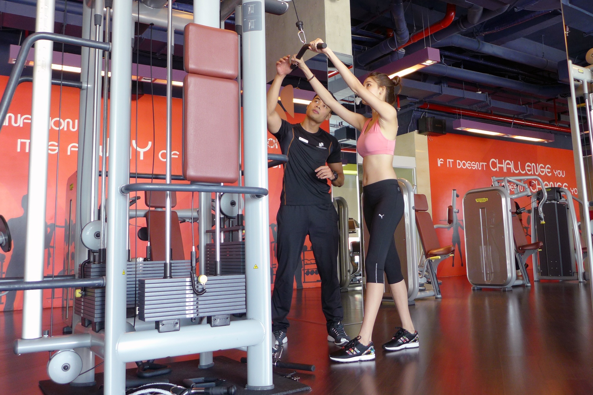 | Chưa quen với việc tập luyện, Kỳ Hân thường nhờ tới sự giúp đỡ của huấn luyện viên để làm quen với các máy tập cơ bản như chạy bộ, đạp xe, kéo tạ...