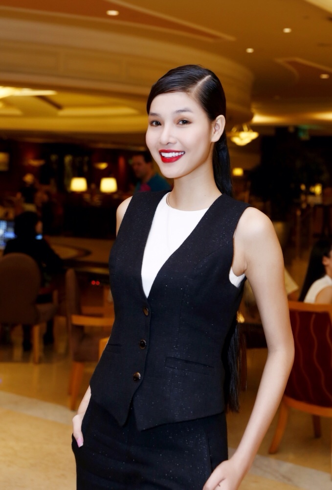 Bạn gái cũ của diễn viên Huỳnh Anh diện trang phục vest đóng bộ rất hợp mốt. Cô nổi bật hơn hẳn các đàn chị cùng công ty khi có buổi gặp gỡ trước chuyến lưu diễn tại Mỹ.