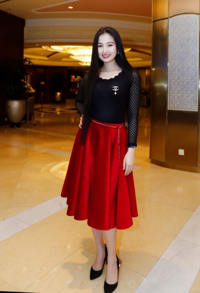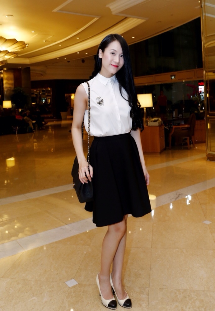 Thái Hà nhẹ nhàng với áo sơ mi và chân váy tối màu.
