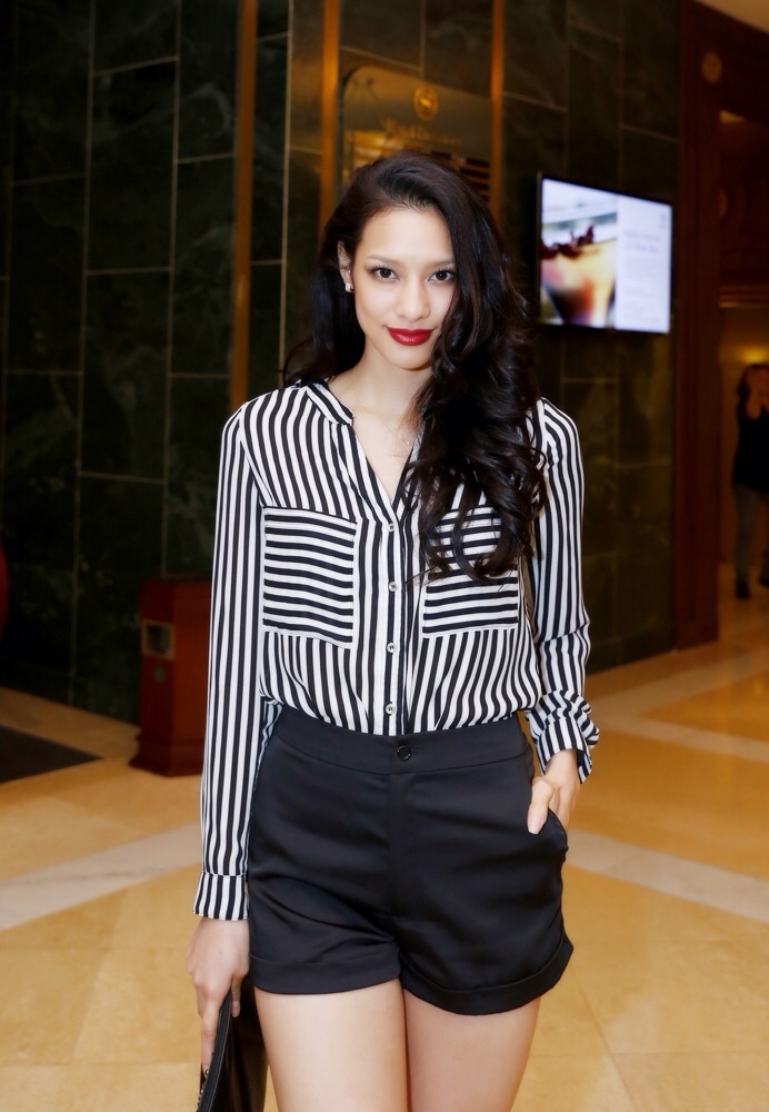 Người mẫu Kỳ Hân diện trang phục khá cá tính với quần ống rộng, áo ghi-lê lửng không tay sành điệu và hợp mốt. Đây là một trong những phong cách được cô ưa chuộng trong thời gian qua. Đi kèm trang phục, người đẹp chọn kiểu tóc đuôi gà cột gọn gàng, son môi màu đỏ đậm.