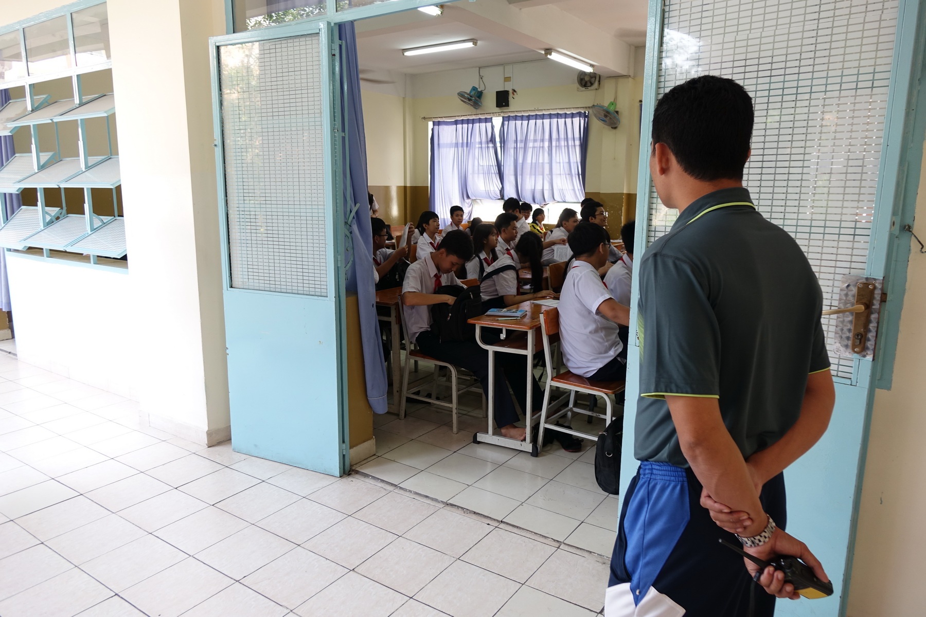 | Giám thị là một nghề vất vả và không thể thiếu tại các trường phổ thông để giữ nề nếp kỷ luật nhà trường và quản lý các hoạt động của HS. Trong ảnh: Giám thị một trường THCS đang quan sát lớp học - Ảnh: Tuổi Trẻ. |